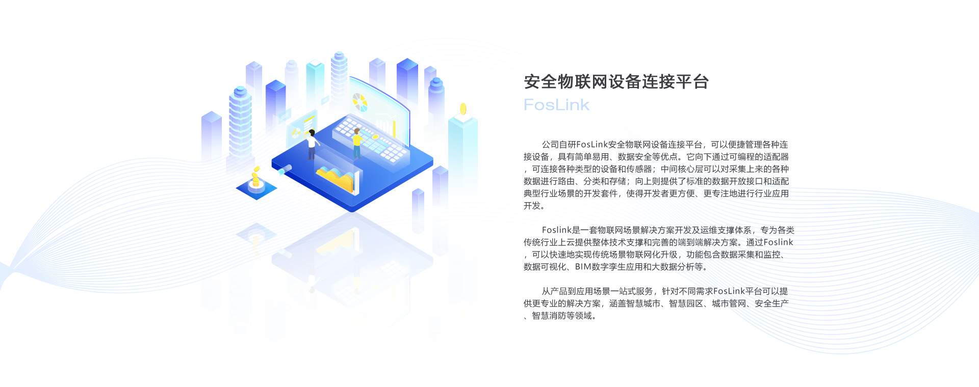從產(chǎn)品到應(yīng)用場景一站式服務(wù),針對不同需求FosLink平臺(tái)可以提供更專業(yè)的解決方案,涵蓋智慧城市、智慧園區(qū)、城市管網(wǎng)、安全生產(chǎn)、智慧消防等領(lǐng)域。